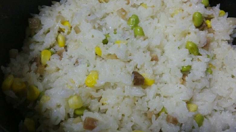 6. 将炒过的腊肉青豆倒入米锅,加入一丁点盐味(腊肉有盐味),搅拌均匀。