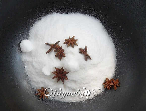 7. 铁锅温热,放食盐加几粒大料小火炒(我用了3袋食盐)