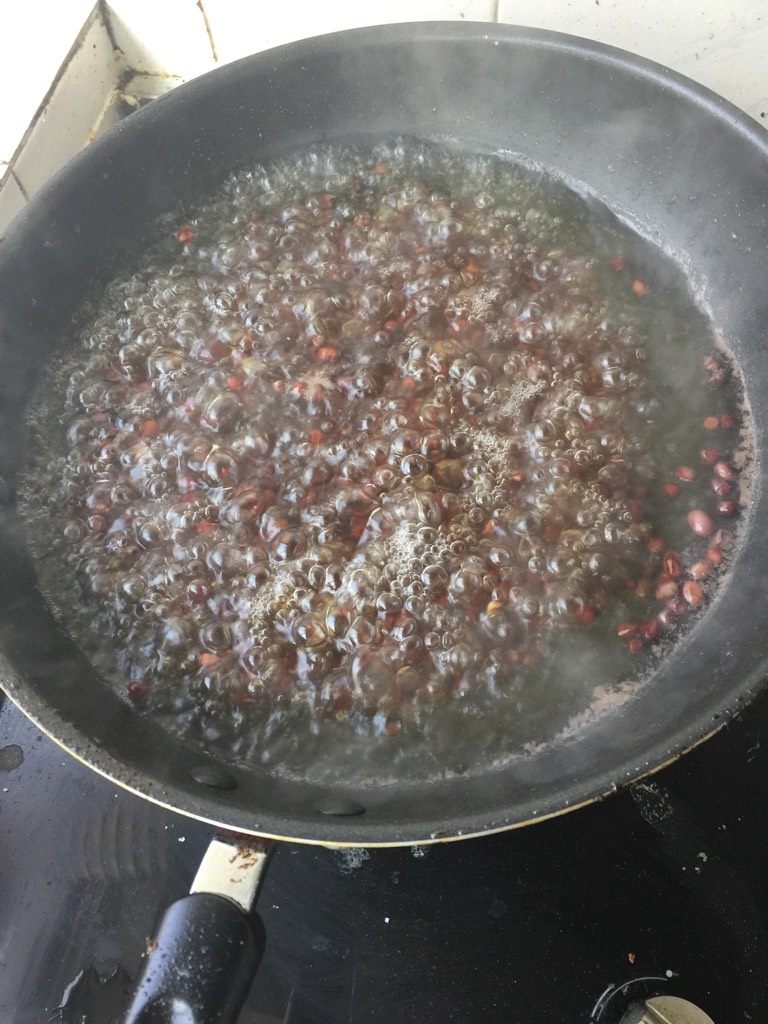 5. 如图,把红豆粉末放入锅中,倒入5勺油,放入白糖5勺,翻炒几分钟盛出