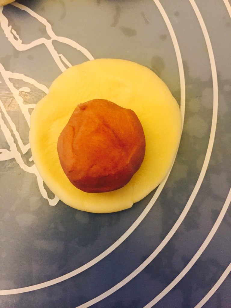 15. 此时将皮箱内的椰蓉馅取出,包好。收口向下。