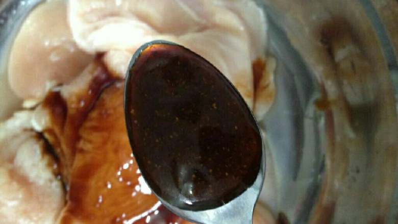 1. 鸡胸肉切片,加入两勺烤肉酱