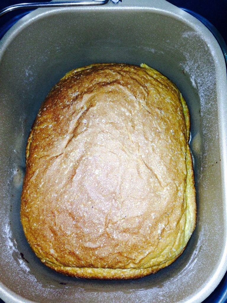 1. 南瓜蒸成泥,装一量杯倒进面包桶内,依次加入白糖、盐、面包粉、酵母