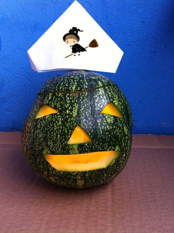 2. 如图把南瓜里面的果肉用勺挖空,然后根据自己喜欢的样子用小刀刻出样貌。