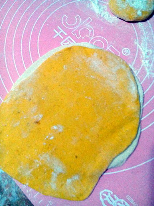 5. 将白色面片上加上少许水,放上南瓜面皮。