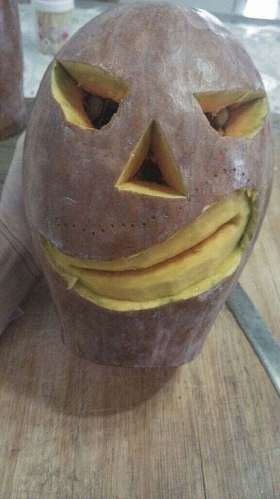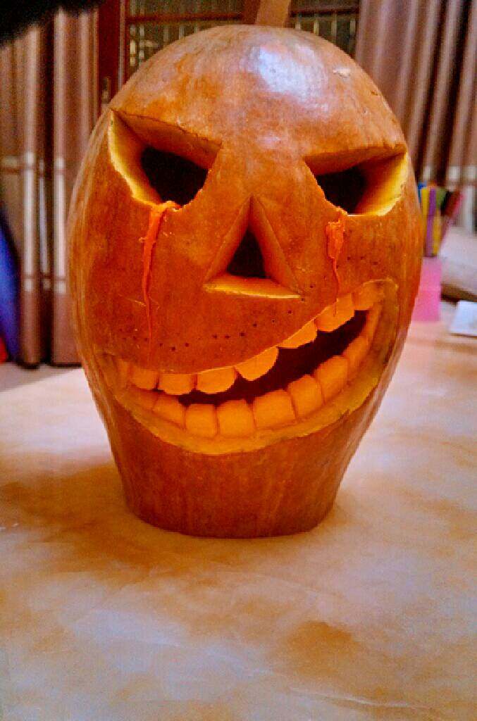 1. 把画好的图用牙签固定在南瓜上,再用牙签在画线上扎下痕迹