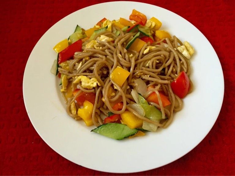 10. 如图锅中留油,油热放入青、黄椒,洋葱,黄瓜翻炒至八成熟,放入鸡蛋同炒加入面条,撒入适量盐翻炒均匀
