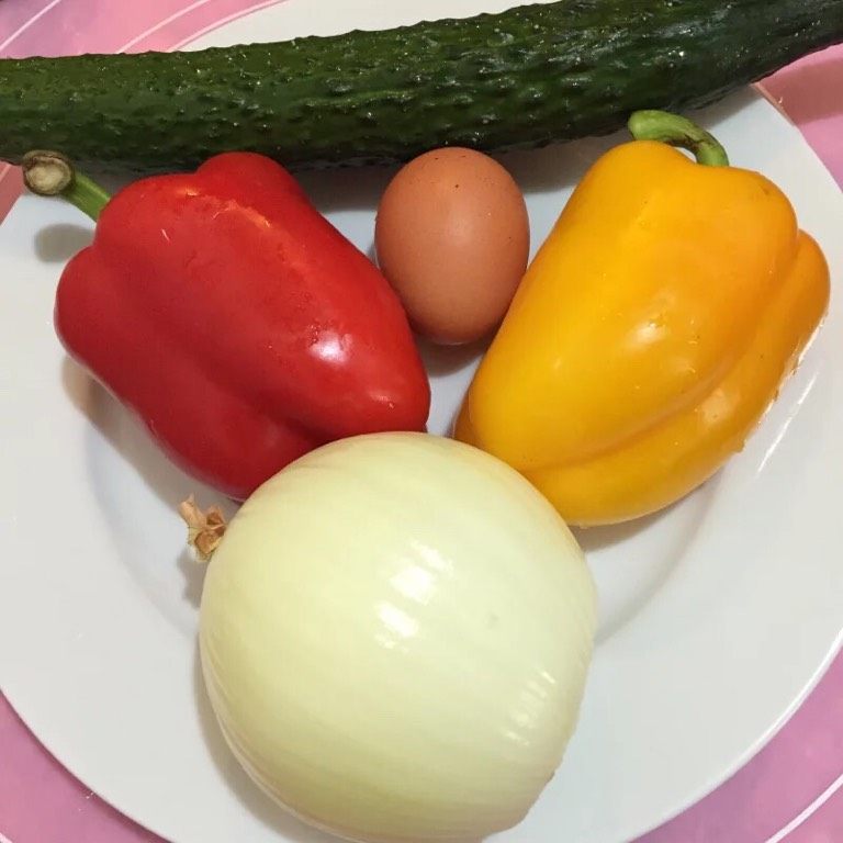 9. 如图锅中留油,油热放入青、黄椒,洋葱,黄瓜翻炒至八成熟,放入鸡蛋同炒
