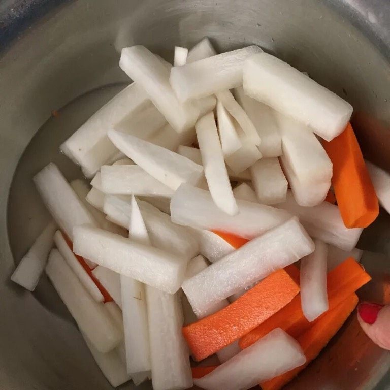 2. 切成萝卜条加入盐腌制两到三个小时,每隔一个小时将萝卜腌出的水倒掉