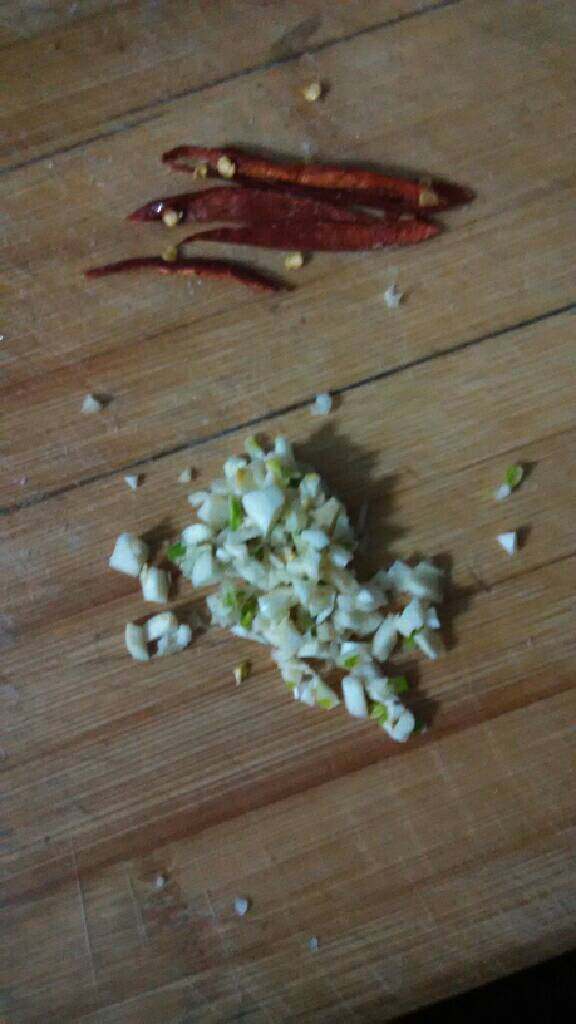 3. 辣椒切丝,(没有彩椒只能用干辣椒了)大蒜切粒