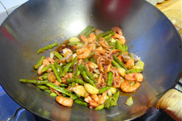 8. 另起锅,放入已经炸熟的毛蒜和豆角。