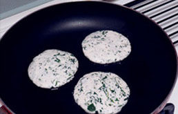 7. 平底锅中加油,开小火。面团分成小份,搓圆压扁,放入油锅。那星星点点的碧绿点缀在雪白的面饼上,非常好看