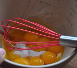 2. 加入隔水(或微波)加热至40度的蜂蜜,搅拌到膨松发白