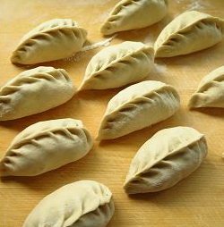 12. 擀皮,包入地皮菜馅料,捏成柳叶包。