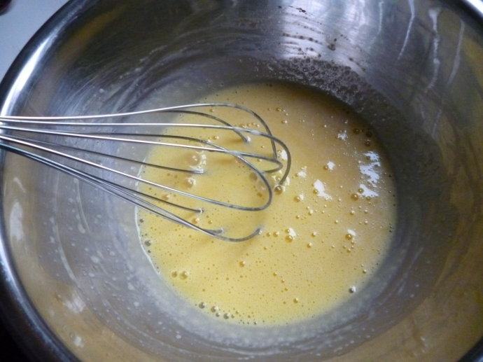 2. 蛋黄加入细砂糖A搅拌至砂糖融化,先后加入鲜奶和玉米油拌匀,最后加入混合过筛的粉类拌匀备用,既成蛋黄面糊。
