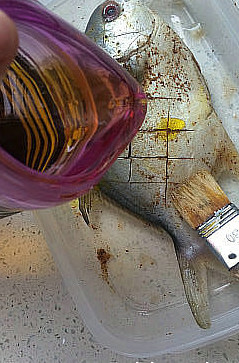 5. 倒入少量油,用刷子刷在鱼身以及鱼尾,鱼鳍部位。两面都刷