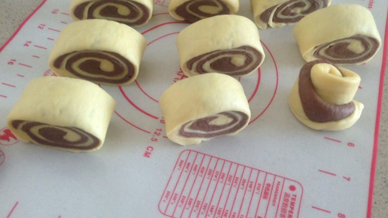 8. 卷好后的面团用刀子切开,进行第二次发酵