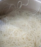 7. 钢丝面放入凉水,用双手搓散,不要让面条粘在一起,然后捞出控水