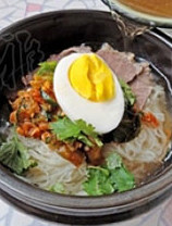 11. 牛肉摆放在面条上,放韩国泡菜,鸡蛋,沿着碗的边缘慢慢倒入冰镇的牛肉汤