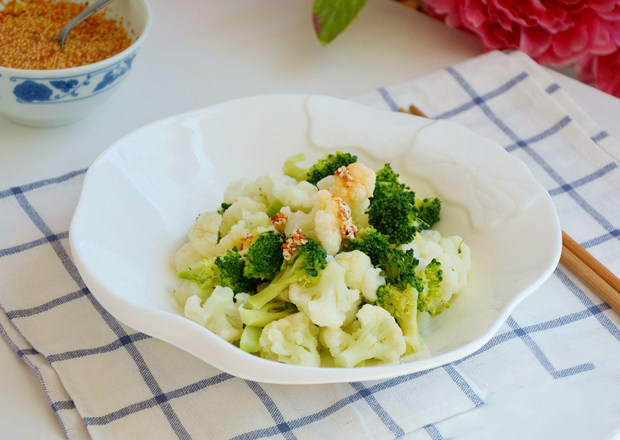 菜花又被称为花菜,椰菜,有白菜花和绿菜花之分。绿菜花也就是我们常说的西兰花。两种花菜都是甘蓝的变种,富含维生素B和C,口感鲜嫩,营养丰富。 今天这道凉拌双花,从名字上就能知道是两种菜花的组合,用了焯水的方法,简单地拌了一下,却清爽鲜嫩。一人食,简单、清爽、却能补充营养和植物纤维。
