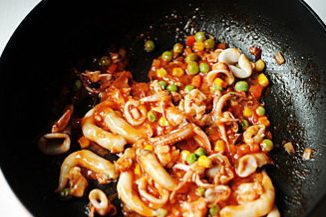 4. 平底不粘锅加少许油,开小火,加入海鲜和蔬菜,转中火炒至海鲜颜色开始变白;