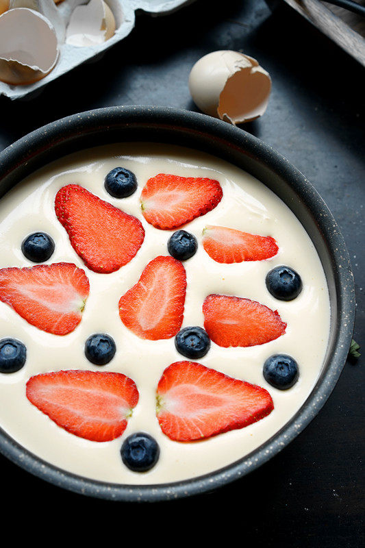 6. 倒入不粘模具中,轻震几下,震出大气泡,在表面摆上切片的草莓和蓝莓