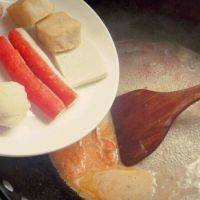 2. 锅内放些许橄榄油,下入鲜虾煸炒至变色,放入叻沙酱炒香。