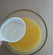 5. 将牛奶倒入蛋液中,朝一个方向搅拌至均匀,静待3分钟,让两种液体溶合。