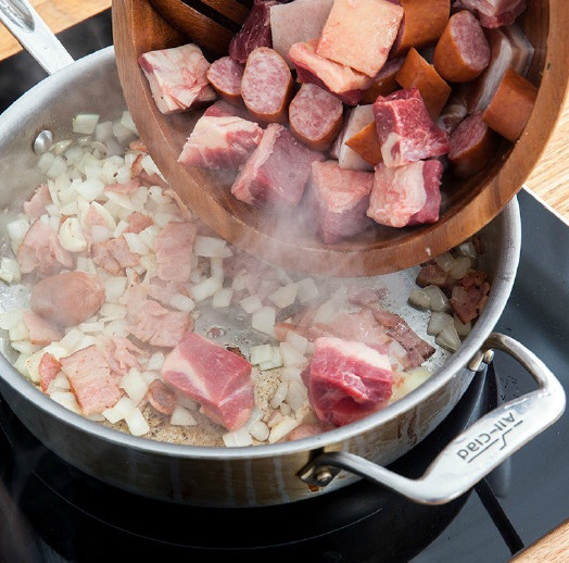 3. 加入牛肉、猪肉、香肠一起翻炒