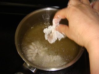 10. 煮锅热油到放入筷子起泡然后将裹上生粉的鱼块放进去炸熟捞起沥干油份。