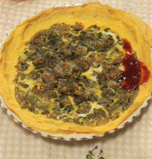 7. 沿锅边倒入蛋液,煎熟出锅。