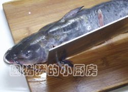 2. 用斩刀将鲶鱼头侧的尖剌斩掉,这里很容易剌伤手。