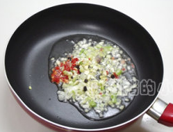 4. 炒锅烧热,加入油冷油放入姜、蒜、葱白、红椒碎炒出香味。