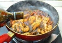 6. 炒出香味后放入大虾,不断煸炒,同时放入生抽两勺,黄酒一勺增加香气