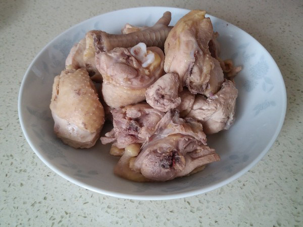 3. 鸡肉斩块,清水洗净后,冷水下锅,加入1汤匙料酒,水沸后再煮1-2分钟