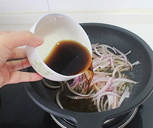 8. 平底锅内放适量花生油,油热后下洋葱丝煸炒出香味。