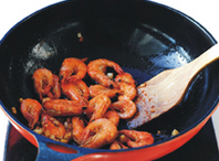 3. 锅里倒油烧至七成热热,放入虾炸至变红壳酥脆后捞出。