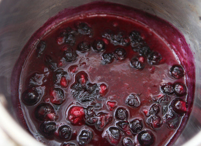 2. 如同做蓝莓果酱的方法,锅开小火,将细砂糖和蓝莓混合在一起,用木勺压碎成糊。