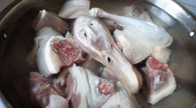 4. 煮好的鸭块捞出冲去血沫,放进电饭煲