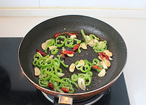 5. 利用锅底余油,下蒜瓣和干辣椒炒出香味。