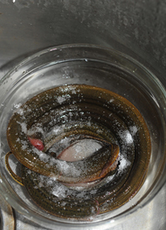 我记得我小时候看我妈妈处理黄鳝,我妈都会把杀好的黄鳝事先用开水烫下,说是这样可以烫掉黄鳝表面那层黏黏的东西。可是当我长大后,又发现我妈在烧黄鳝之前不烫了,问她原因,说是这层粘液有营养,最好不要烫。 这次我做黄鳝前,特地上网查了下,发现了比较靠谱的答案:洗黄鳝时,不要洗掉它身上的粘液。因为这层粘液由粘蛋白和多糖组成,它不但能促进蛋白质的吸收和合成,还含大量人体所需的氨基酸、维生素A1、B1、A2和钙。可以事先用热油炒出它的异味,再和其它食材一起煮。 实际做的时候,我又发现问题了,不用开水烫过,黄鳝滑不留手,压根拿不住。于是按照网上查到的,撒了些盐,把黄鳝捏了几把后再清洗掉,果然黄鳝就不那么滑了,再用一块干净的抹布按住黄鳝,就能顺利的切了。