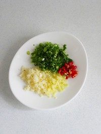 5. 淋入酱汁,再将切好的香葱,姜蒜,香菜和泰椒末放入。