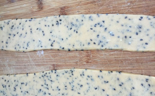 4. 从中间竖切一刀开个口,两片摞起来,别切到头