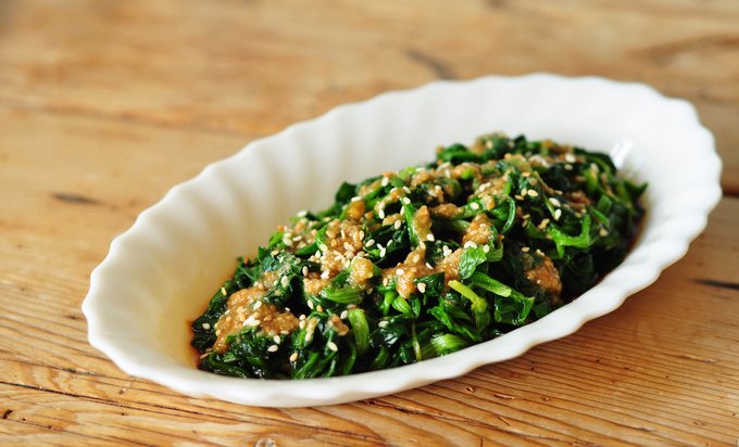 - 我用的嫩菠菜,茎很短很嫩,所以整根一起煮的,如果是买的那种非常粗壮的大菠菜,可以先把茎塞锅里煮一会儿,再把叶子拌入;最后挤干多余的水分,意思是把菠菜之外的水挤掉,而不是挤得跟牛肉干那样,把菜本身里面含有的水分都挤掉哦,我表达能力好差啊你们懂的)。