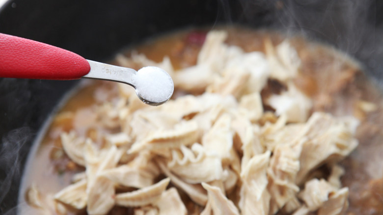 7. 倒入切好的笋干,加盐,转小火烧45分钟。