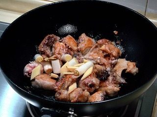 5. 完全把鸡块煎至金黄色后,放入腌鸡时用的葱姜香料等翻炒均匀。