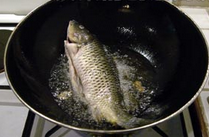 3. 炒锅烧热,放入足够多的油(可以将鱼淹没),烧至8成热,(开始有烟)将鱼放入,炸1分钟左右。
