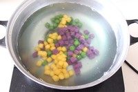 13. 都切好后,水煮开后放入水里一起煮至漂起来即可,煮好的芋圆放入冷开水里待用。