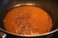 3. 锅内放适量油,倒入酱油,白砂糖和料酒煮开,略微浓稠之后,关火备用