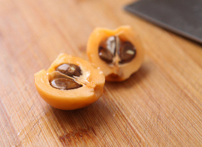 4. 把核去掉。核与果肉之间有一层膜,要是有时间,就把这层膜撕掉。再切一刀,一颗枇杷分成四瓣。