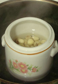 2. 倒入罐盅内,加水盖过莲子,洒一勺白糖或冰糖。